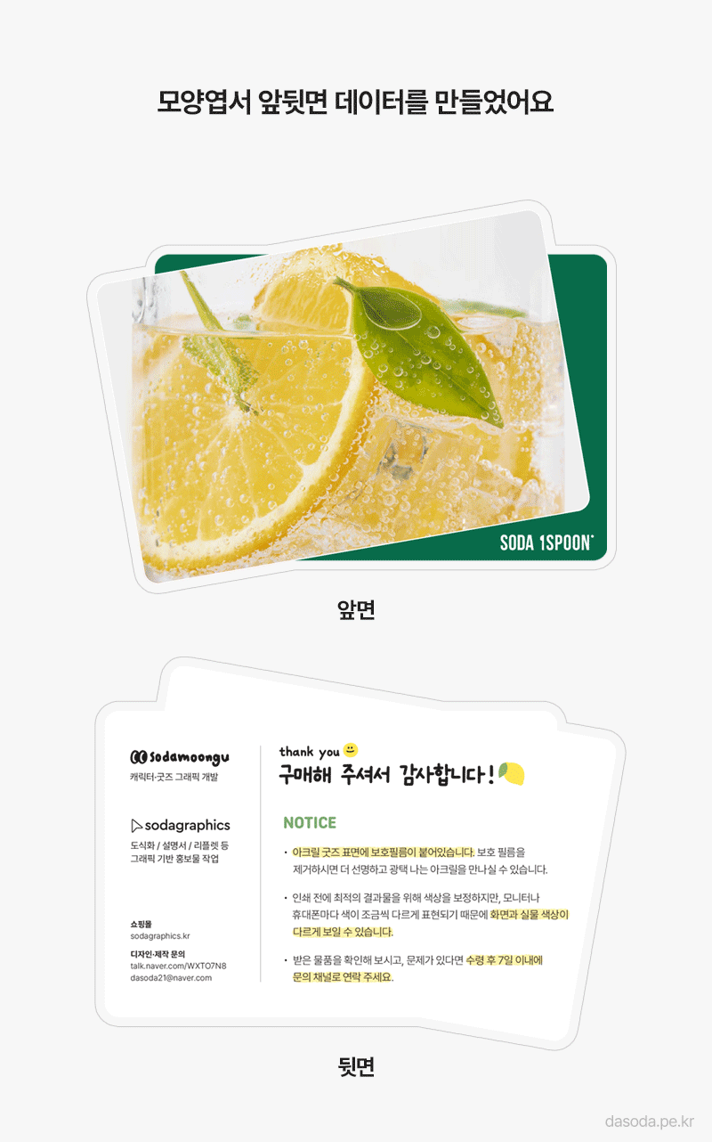 그래서 앞면을 레몬에이드(소다), 뒷면에 구매 감사 인사를 넣어서 모양 카드를 제작했습니다. 칼선을 테스트하기 위해서 카드를 두 장 겹친 모양으로 디자인했고요, 예상 칼선도 함께 넣어서 작업해보았습니다. 안쪽이 데이터, 바깥쪽 회색이 칼선으로 예상하는 부분입니다.