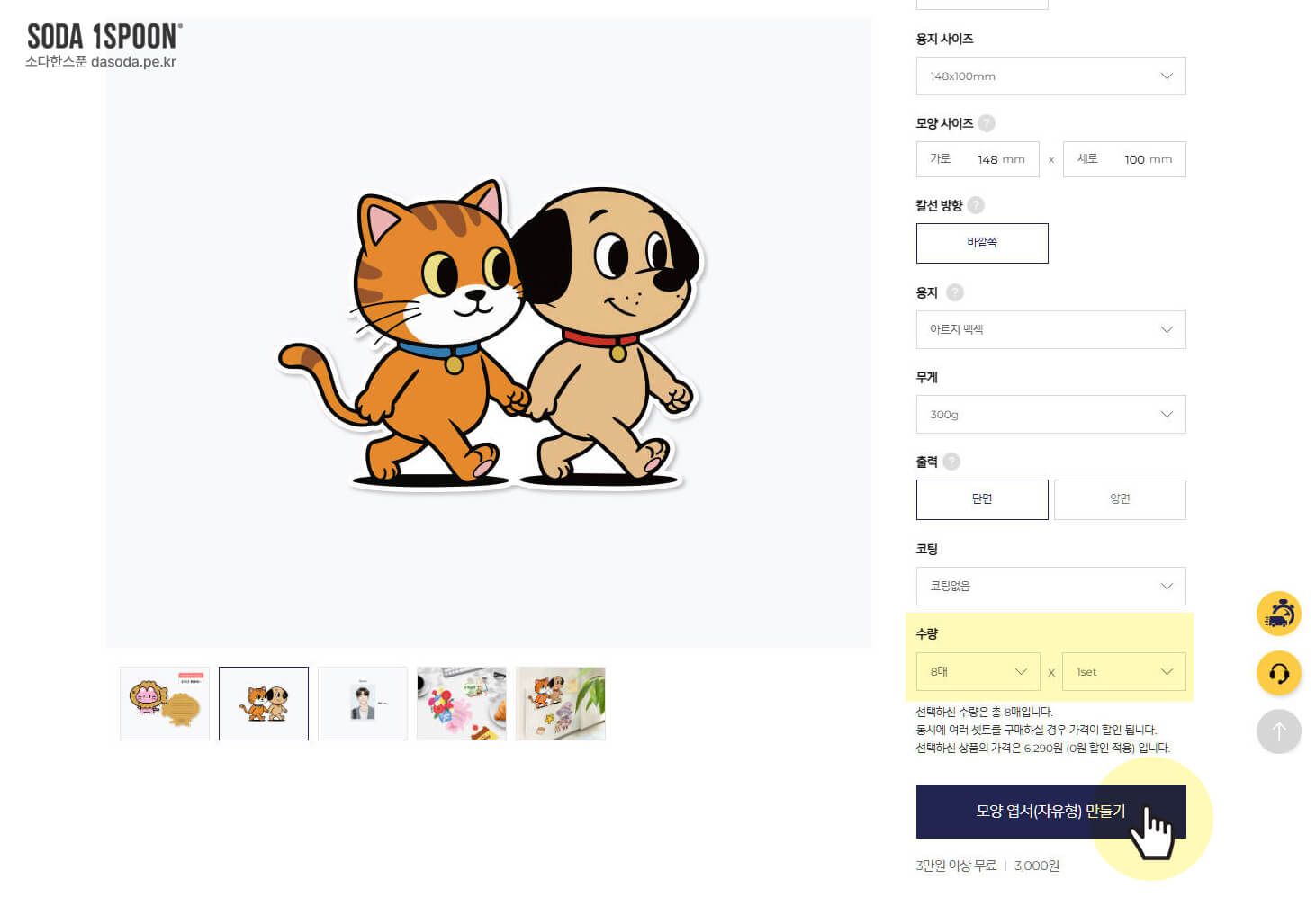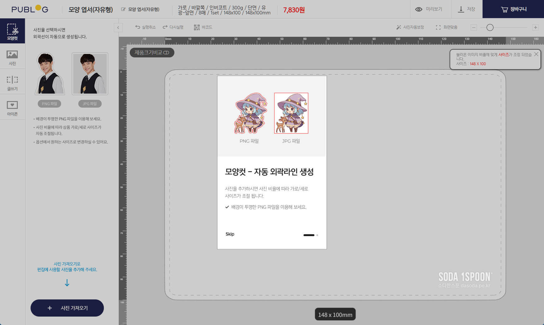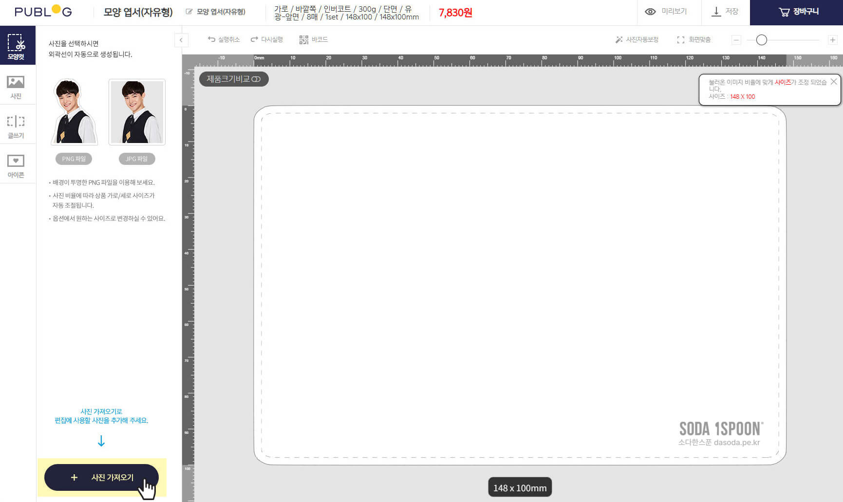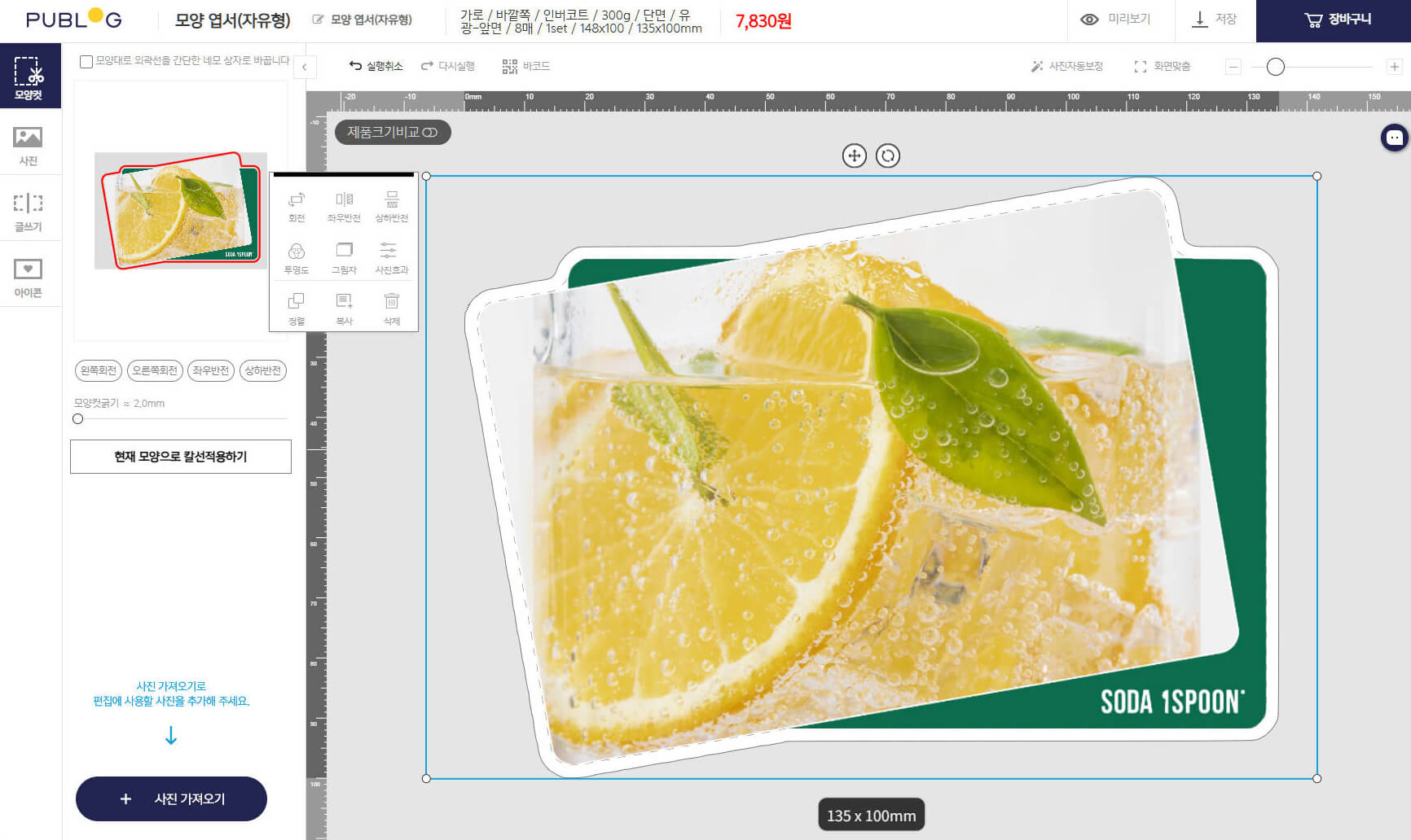 퍼블로그 사이트에서 원하는 옵션을 정하고 모양엽서(자유형) 만들기
