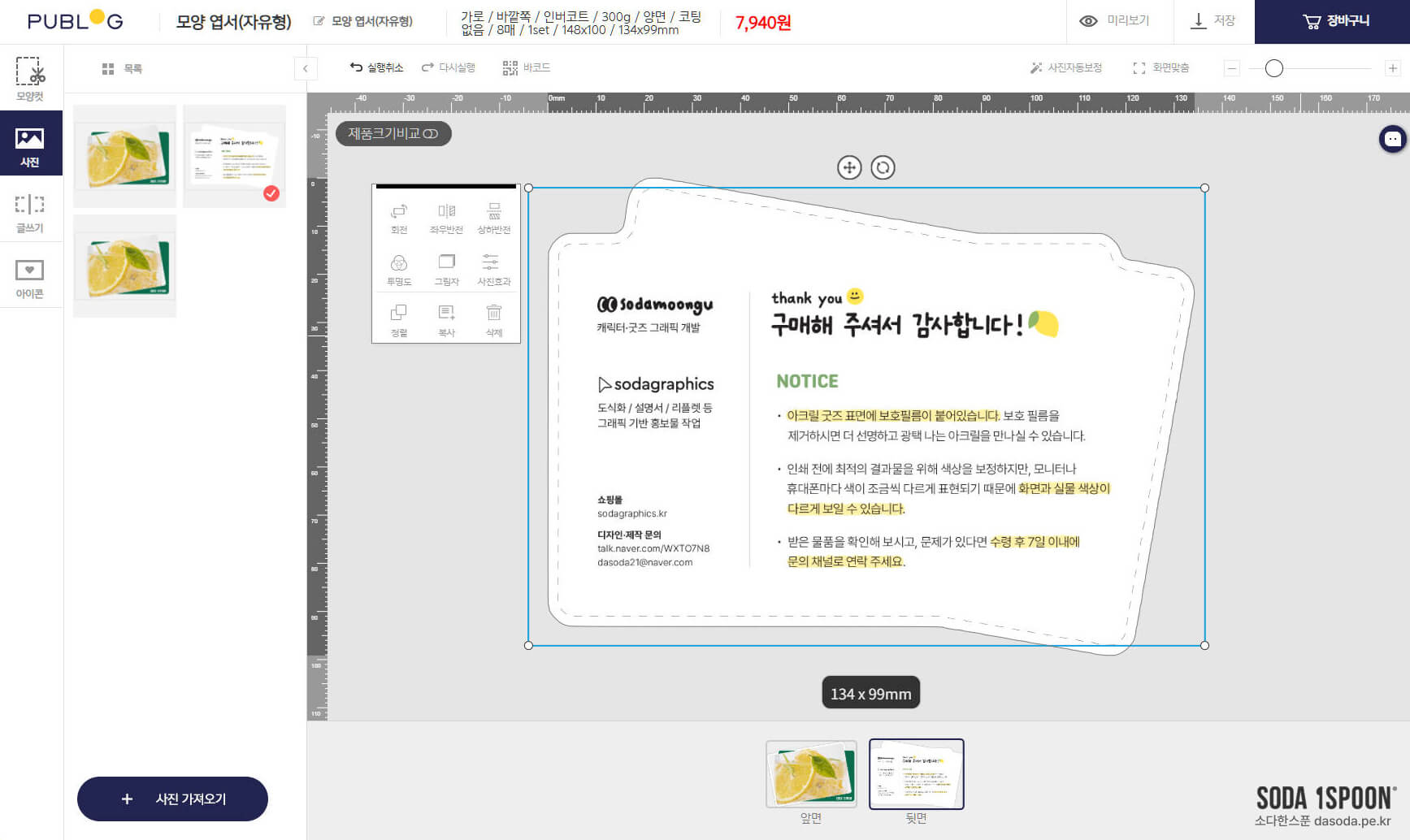 뒷면도 자동으로 칼선이 적용되는데, 뒷면에는 자동으로 사진 채우는 기능은 왜 없는지 모르겠네요. 😭😭 뒷면은 어차피 흰 배경에 진행할 거라서 적당한 크기와 위치로 맞추어 넣어주었습니다.